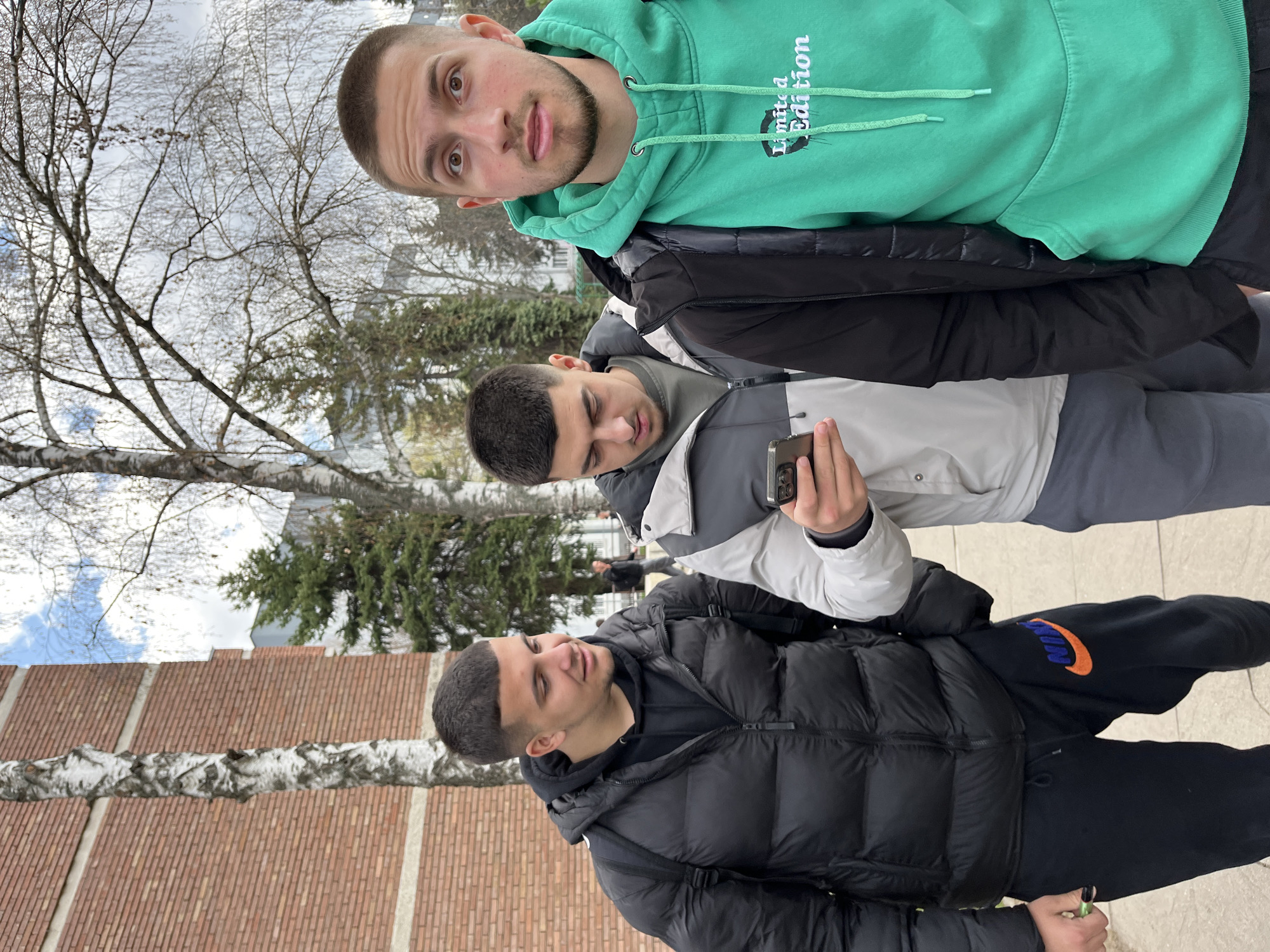 Three young adult males are positioned in the foreground of an outdoor urban environment in Sofia, Bulgaria. The leftmost male, featuring dark, short-cropped hair, wears a black puffer jacket over a black hoodie and black sweatpants with an orange and blue Nike logo; he carries a black backpack and holds a small green object in his left hand, looking towards the center male with a slight smile. The central male, also with dark, short-cropped hair and light stubble, wears a grey and white two-tone jacket over a dark top and grey trousers; he is focused on a dark smartphone held in both hands, looking down at its screen. The rightmost male, with dark, short-cropped hair and light stubble, wears a bright emerald green hoodie with "Limited Edition" text beneath a black jacket; he gazes directly at the camera with wide eyes and a slightly open mouth. The background on the left consists of a red brick building. Several birch trees with sparse, bare branches and some evergreen trees are visible, with a partly cloudy sky overhead. A blurred figure is present further in the background. The ground is a paved surface.