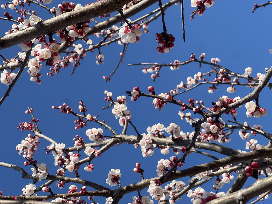 - "This image, captured in Gelendzhik, Russia, presents a low-angle view of a tree canopy filled with blossoms and buds set against a clear, unclouded blue sky" by FM-Q4irk1, licensed under CC BY 4.0