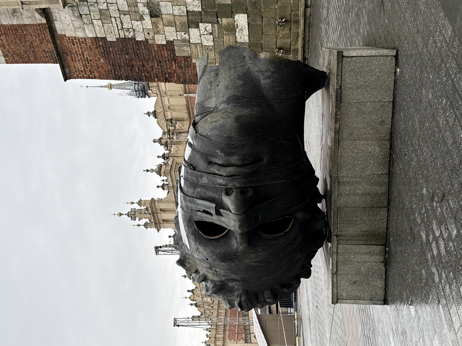 - "The image depicts a large, dark-colored sculpture of a truncated human head resting horizontally on a grey stone pedestal" by FM-XR4443, licensed under CC BY 4.0