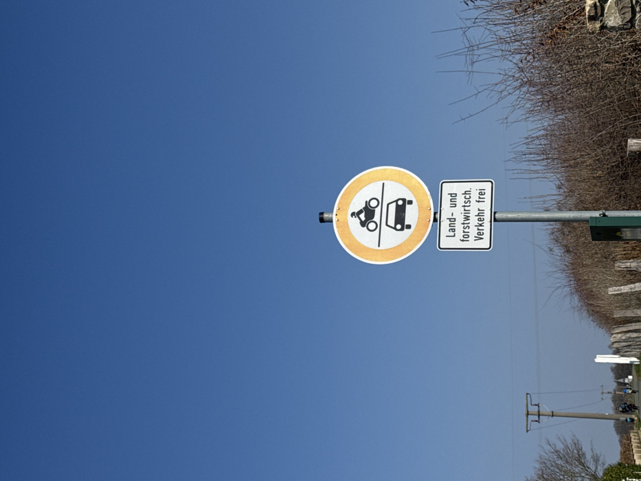 This image captures a rural roadside scene in Echzell, Germany, under a clear blue sky. A tall, gray metallic pole stands centrally, supporting two vertically stacked road signs. The upper sign is circular with a yellow border, a white background, and black pictograms: a motorcycle rider above a horizontal line and a car below it, indicating a general prohibition for these vehicles. Directly beneath it, a rectangular white sign with black text reads "Land- und forstwirtsch. Verkehr frei," which translates to "Agricultural and forestry traffic free," signifying an exemption. A small green utility box is attached to the pole's base on the right. To the left of the pole, a paved path extends into the distance. Two individuals, identifiable as cyclists, are observed moving away from the viewer along this path. Further along the path, a utility pole with a T-shaped cross arm is visible, and in the far distance, a faint white structure resembling a church steeple can be discerned. The right side of the foreground features a dense thicket of bare-branched shrubs, characteristic of winter or early spring, behind which a low stone wall is visible.