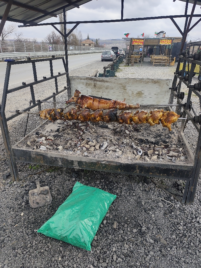 An outdoor culinary scene is depicted near Pernik, Bulgaria, under an overcast sky