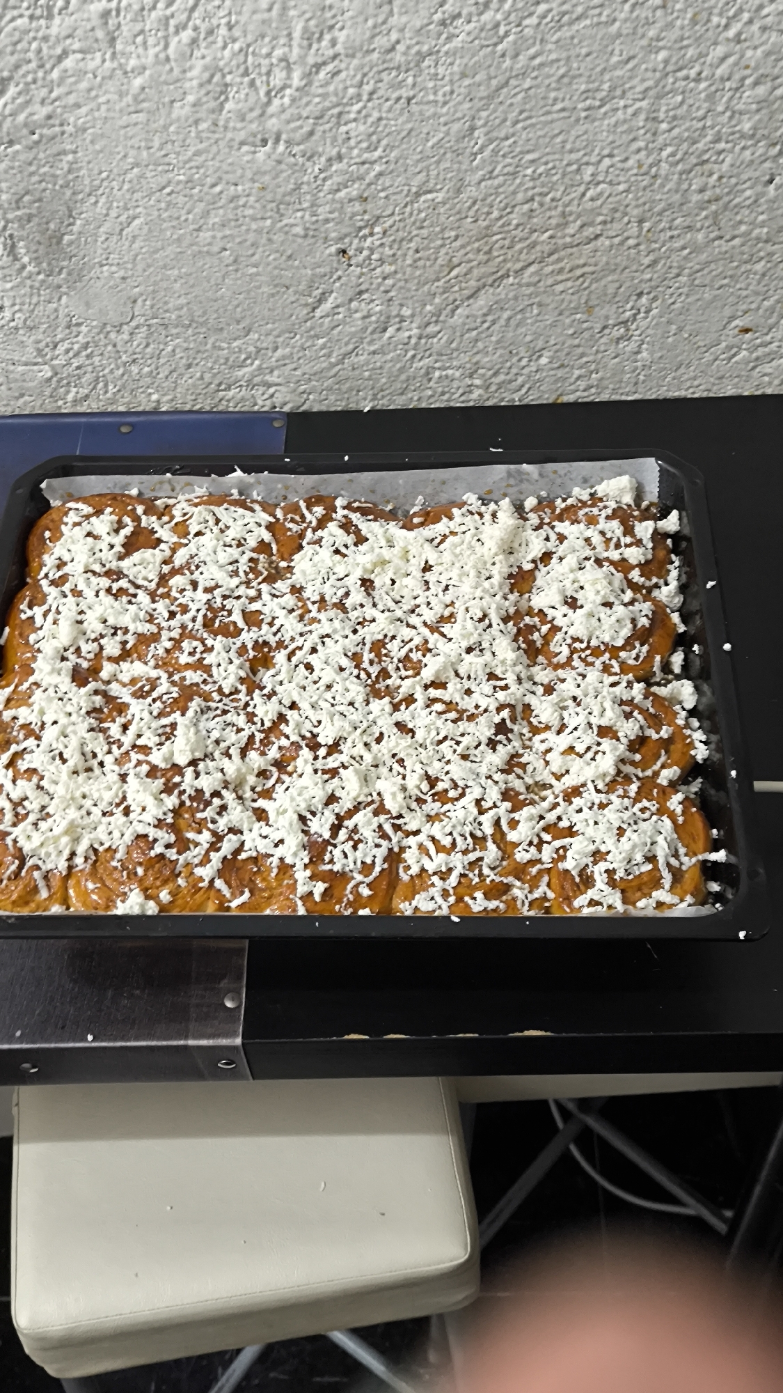 The scene depicts an indoor setting in Ripollet, Spain. A large rectangular black baking tray, lined with white parchment paper, occupies the central midground. Inside the tray is a prepared dish with an orange-brown base, fully covered by a dense, uneven layer of small, irregular white solid pieces, consistent with crumbled or grated cheese. The tray rests on a dark, flat surface, possibly a countertop or table. Above this surface, a textured, off-white wall serves as the background. Below the dark surface, to the left, the upper portion of a light-colored upholstered stool or chair cushion is visible. A blurred, orange-toned fingertip appears in the bottom right corner of the image, indicating the presence of a person. No other individuals are visible.