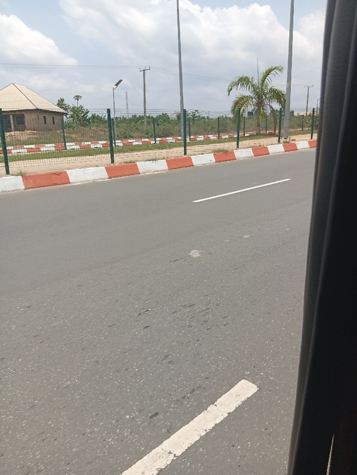 The image depicts a daytime outdoor scene along a paved road in Uyo, Nigeria, observed from inside a vehicle, evidenced by a dark vertical pillar partially obscuring the right side of the frame. The foreground features a grey asphalt road with a single broken white lane marking near the bottom right. Adjacent to the road, a concrete curb is visible, painted in alternating sections of red and white. Beyond the curb, a green wire mesh fence with metal posts runs parallel to the road, separating it from an undeveloped area. This area contains reddish-brown earth and a dense growth of green vegetation, including various bushes and a prominent palm tree towards the right. In the background, on the left, a single-story building with light-colored, possibly thatched or corrugated, multi-faceted roof and light brown walls is partially visible. Multiple utility poles, some wooden and some metal, support power lines, and tall metal streetlights with overhead fixtures are spaced along the roadside. The sky is partially cloudy. No people or animals are present, and no explicit actions or interactions are occurring.