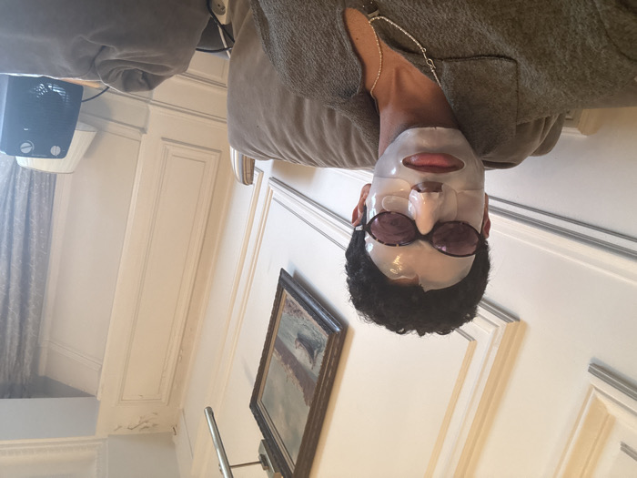 - "A person with dark curly hair wears a sheet mask and dark sunglasses while reclining against a light-colored cushion" by FM-98Chk1, licensed under CC BY 4.0