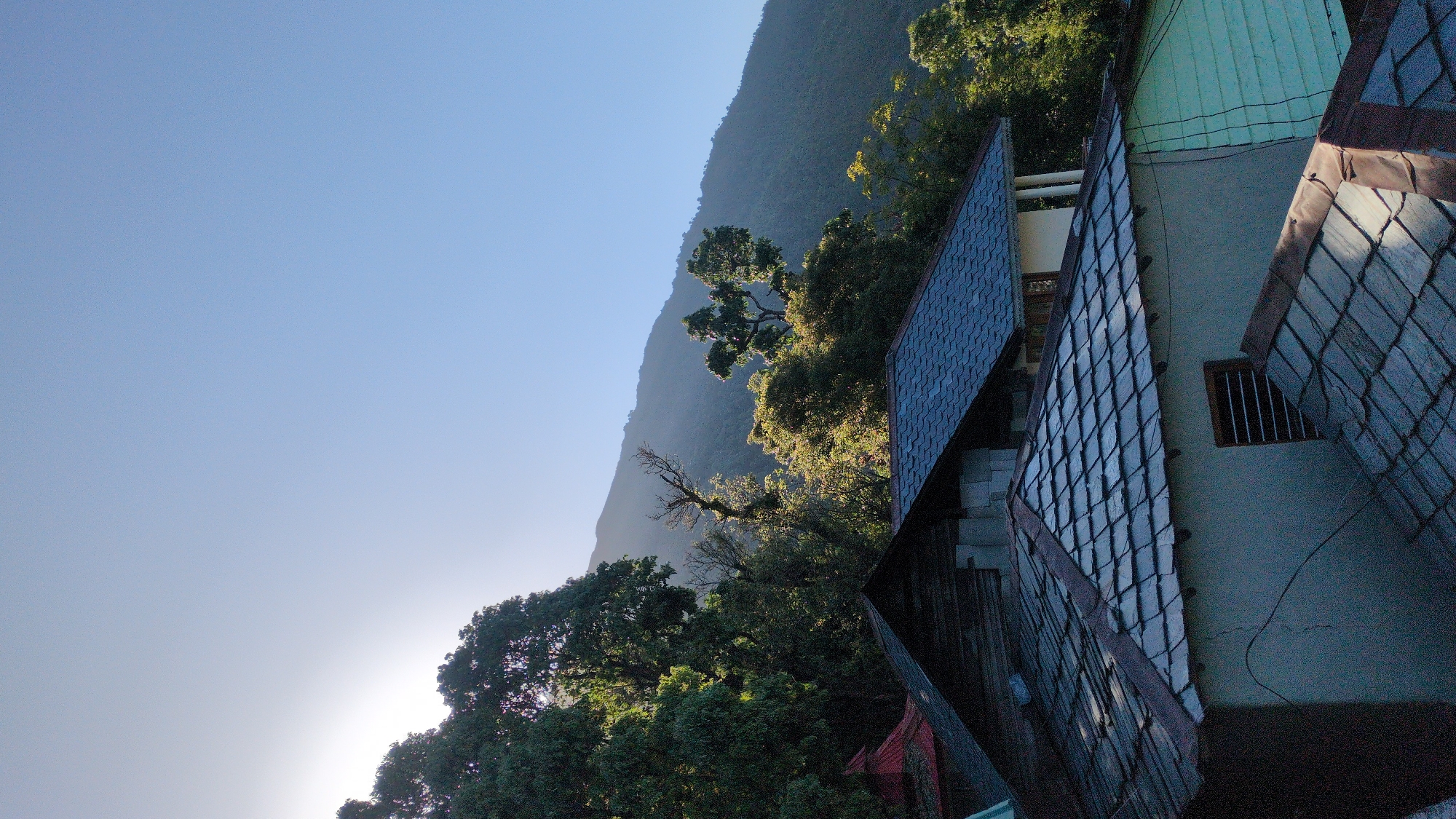 The image depicts a daytime scene in Haini, India, showcasing a building with a tiled roof and a mountain in the background. The sky is clear and blue. Lush green trees surround the building, partially obscuring the view of the mountain. The building's roof appears to be constructed of individual tiles, possibly slate. A single window with bars is visible on the side of the building. Sunlight filters through the trees, creating highlights on the leaves and the building's surface.