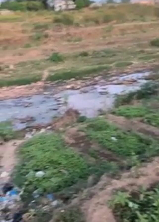 wide shot of a dirty river flowing through a landscape with scattered vegetation. The river appears murky and contains debris. The riverbanks are covered with patches of grass and what looks like small cultivated plots of land. In the foreground, there is a significant amount of litter and plastic waste. The background features a few houses on a slight hill, along with trees and open fields. The sky is a pale blue with hints of pink, suggesting early morning or late afternoon lighting.