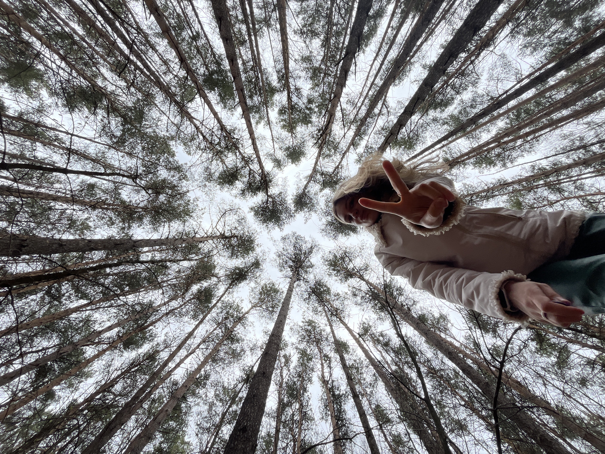 A low-angle shot shows a person holding up a peace sign against a backdrop of tall trees and a cloudy sky. The person is fair-skinned, with long blonde hair, and is wearing a beige jacket with a fur-trimmed collar. The trees are tall and thin, stretching upwards and converging towards the center of the frame. The branches are bare and tangled. The sky is overcast. The photograph was taken in the city of Chaikovsky, Russia.