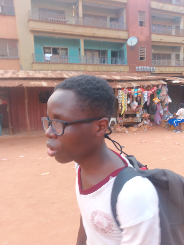A person with dark skin and short hair wears glasses, a white shirt with red trim, and a backpack. The person is in an outdoor setting with buildings in the background. A small shop or stall with various items is also visible. The ground is reddish-brown. The lighting suggests it is daytime, but it is somewhat overcast.