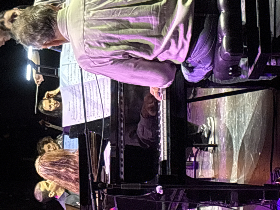 From a low angle, a pianist in jeans and a button-down shirt sits at a grand piano on stage, illuminated by colored lights. Sheet music stands before him. Musicians are visible in the background. A conductor with a baton is standing. One of the musicians has long brown hair and is looking directly at the camera.