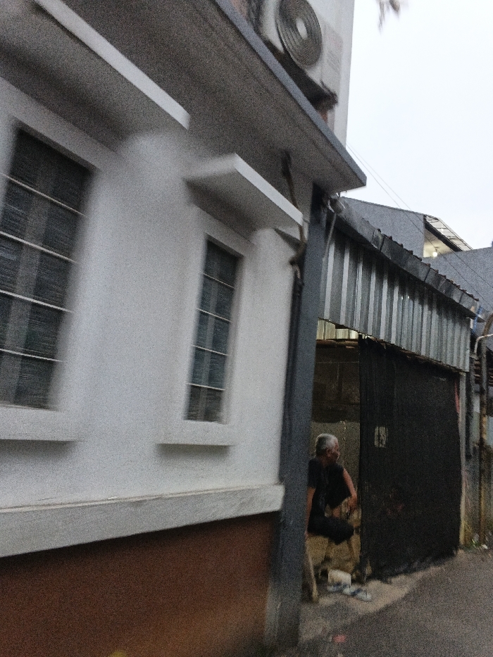 This image displays an urban scene in Bandung City, Indonesia, under an overcast sky. The left side of the frame is dominated by a segment of a white building featuring a brown lower section. Two rectangular windows, each equipped with internal horizontal and vertical grilles, are visible on the white wall. Each window has a white horizontal ledge positioned above and below it. An external air conditioning unit is partially visible mounted high on the building. To the right, an adjacent structure with a corrugated metal roof and a dark, likely wooden or metal, wall forms an alcove or entrance. Within this opening, an elderly individual with short, gray hair is seated or squatting on a low object, facing toward the right side of the frame. The person is dressed in a dark t-shirt and dark trousers. A pair of light-colored sandals rests on the dark, paved ground directly in front of them. The ground surface appears to be asphalt or concrete.