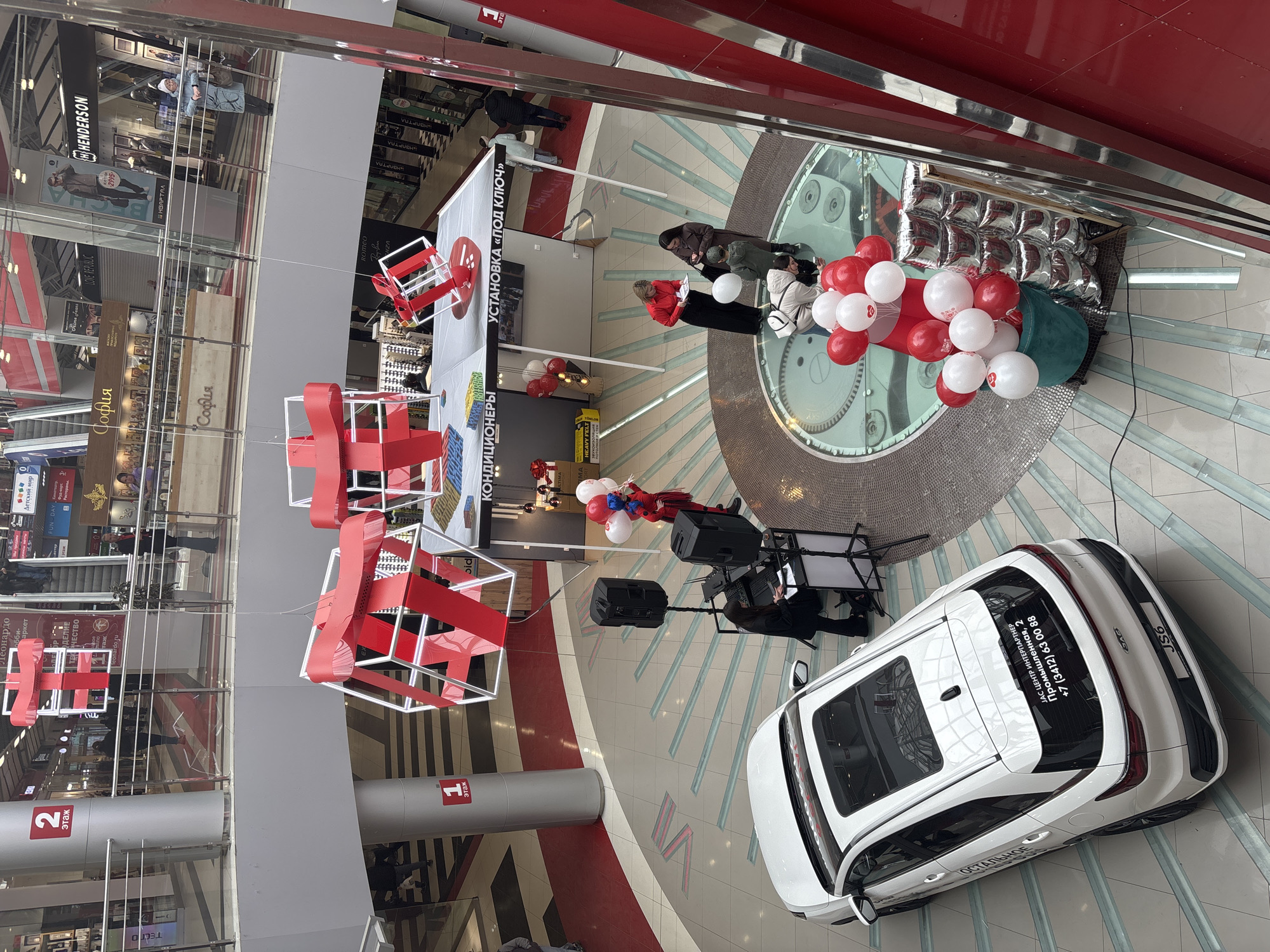 interior of a multi-level shopping center, potentially in Izhevsk, Russia, given the Cyrillic script. Red and white architectural structures hang from the ceiling, possibly for decoration or event purposes. A white SUV is parked on a circular patterned floor area, possibly as part of a promotion. There are several people near the SUV, likely observing or interacting with the display. Speakers and some equipment are also present near the SUV, implying a promotional setup or event. The storefronts visible on the upper levels include "София", "LOVE REPUBLIC", "HENDERSON" and "Детский мир" (Children's World), along with other businesses.