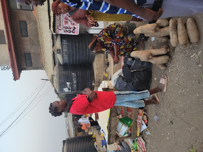 In a bustling outdoor market, a young woman in a red shirt and jeans stands with arms crossed, observing the scene. Nearby, a woman in a patterned dress sells yams, displayed in a pile on the ground. Shoppers mill around, and a building with water tanks is visible in the background. The area is busy with market activity and various items are scattered on the ground.