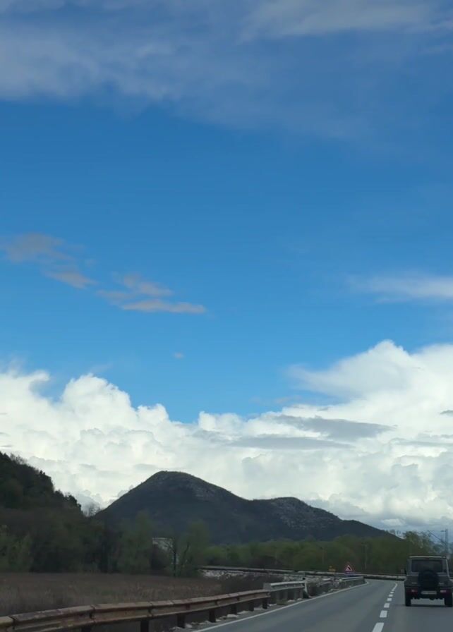 road with a gray surface and white lane markers stretching into the distance. On the right side of the road, a dark-colored jeep travels in the same direction as the camera. A metal guardrail runs along the left side of the road, separating it from a grassy area and trees. In the background, a rounded mountain looms against a sky filled with fluffy white clouds and patches of blue. A road sign is visible on the right side of the road, indicating a sharp curve. The overall environment suggests a rural or mountainous area, with clear weather and good visibility.