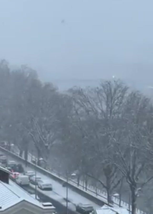 street covered in snow during a snowfall. The road is lined with trees that are also covered in snow. Cars are moving slowly on the road, with their headlights on. The foreground includes the snow-covered roofs of buildings. The sky is overcast and gray. The snow is falling steadily, creating a blurry effect in the distance.