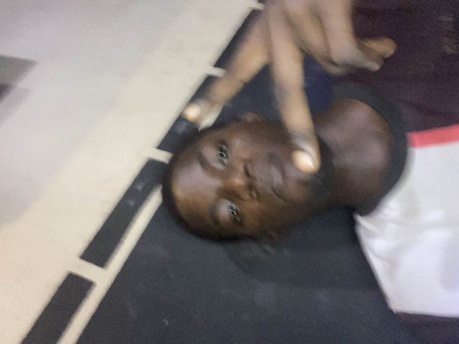 The image presents a blurry, close-up, slightly upward-angled photograph of a single individual, a young Black male, located in Onitsha, Nigeria. The subject is positioned centrally, looking directly at the camera with a neutral expression. He has short, dark hair and dark eyes that show a visible light reflection. He is wearing a short-sleeved shirt with a dark collar; the shirt features a white section on the viewer's left, a dark red/brown section on the viewer's right, and a prominent vertical red stripe separating these colors down the center of the chest. His right hand is raised to the upper right of the frame, performing a gesture where his index finger and pinky finger are extended upwards, while his middle and ring fingers are curled down towards his palm, and his thumb is also curled. The background behind the subject is dark, exhibiting faint horizontal light-colored bands or elements across the upper portion, indicating an indoor environment with architectural details.