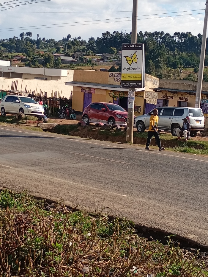 The image depicts a roadside scene in Molo ward, Kenya. A two-lane asphalt road with a faint white dividing line occupies the foreground. To the right of the road, a dirt and gravel shoulder slopes upwards, featuring unkempt vegetation and some litter. A tall, light-colored utility pole stands prominently on the shoulder, displaying a vertical rectangular sign for "MyCredit" loans, featuring a yellow butterfly logo and contact information. To the left of this pole, a red Mazda hatchback is parked, resting on old tires. Further left, a white Toyota Vitz is parked behind a wooden stick fence. Near the white car and fence, a person in a blue shirt is crouched. To the right of the utility pole, a silver Toyota Probox/Succeed wagon is parked. Two individuals are seated on the dirt shoulder to the right of the Probox; one wears a red cap. A man in a yellow t-shirt and dark trousers walks from left to right on the dirt shoulder, carrying a stick or pipe in his right hand. Several buildings line the roadside. A light-brown single-story building with purple door and window frames, displaying signs for "EVERBEST CE" and "ART STARS MOTORBIKES," is situated behind the red Mazda. To its right, a building labeled "Horizon Hotel" is visible. A white building is further left, behind the wooden fence. Bicycles are parked near the purple-doored building. The background features a prominent hillside covered with dense green trees and scattered residential structures under a partly cloudy sky. Overhead power lines are visible.