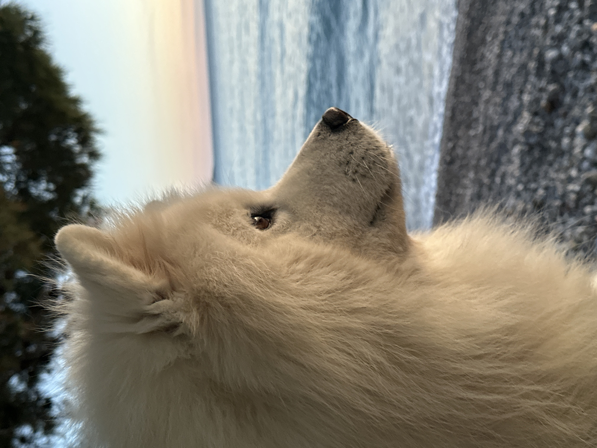 - "A close-up shot depicts a white Samoyed dog looking upwards" by FM-CDHqs1, licensed under CC BY 4.0