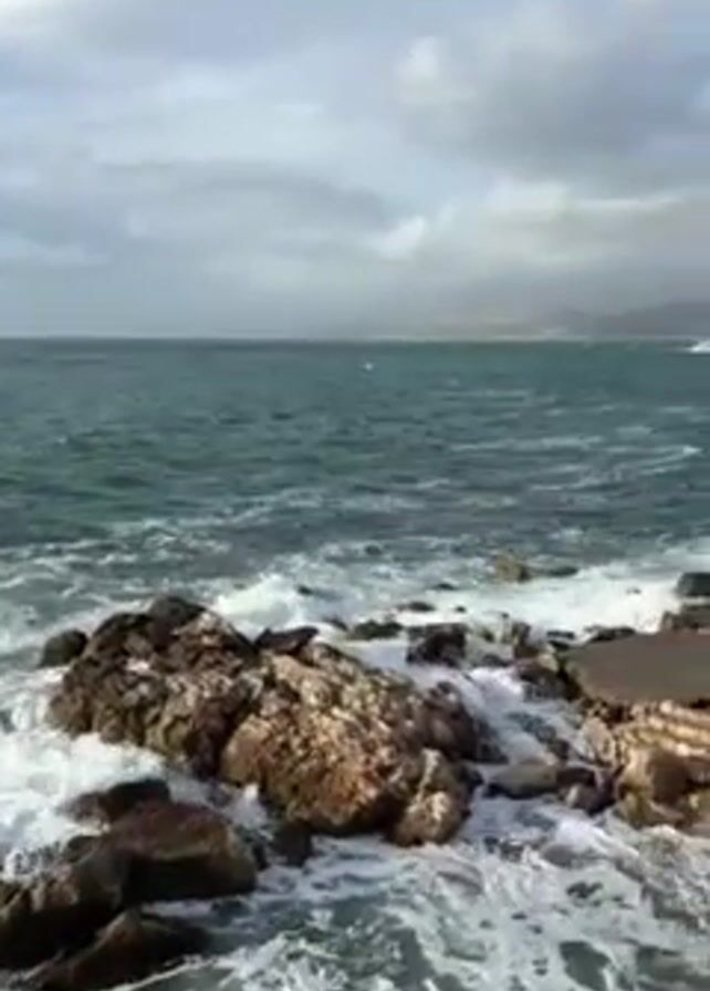 rocky coastline on a cloudy day. Waves crash against the rocks and the shoreline. In the distance, there is land with buildings and mountains. The water is a dark green color and the sky is mostly cloudy, with patches of blue.