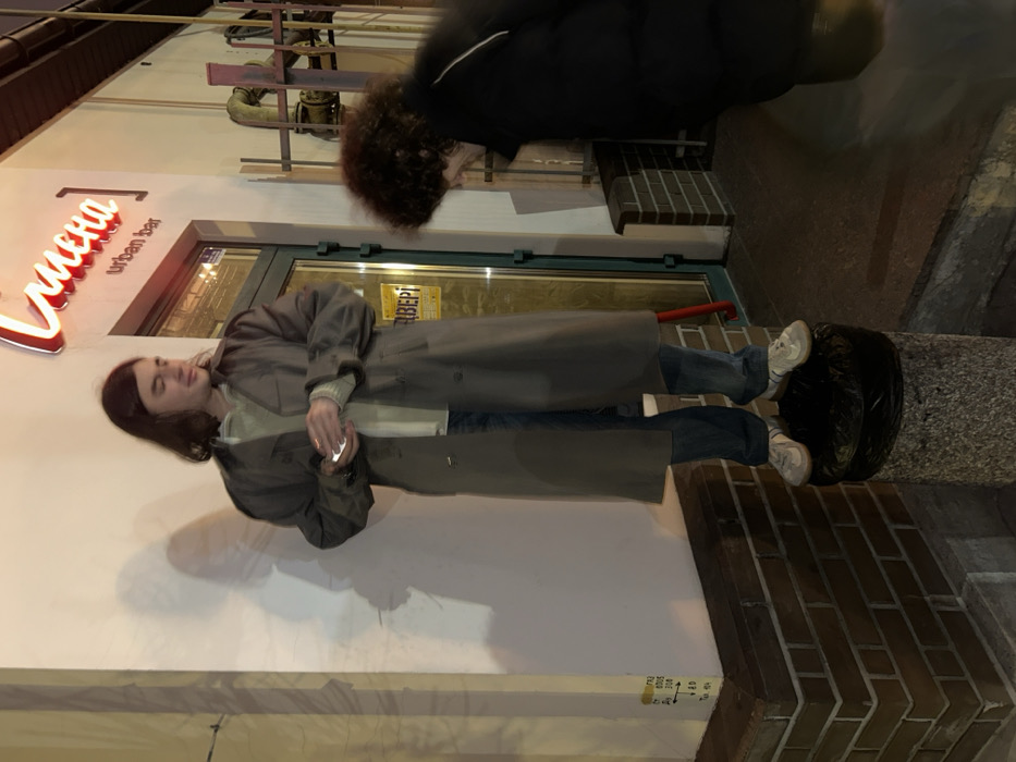 Outside an "urban bar" illuminated by a neon sign, a person in a long grey coat and jeans stands on a black garbage bag, elevated on a brick and concrete structure. The person is facing left and holding a device in their hand. Another person with curly hair and wearing black is partially visible, leaning into the scene from the top edge. The building's façade is light-colored. A red object, possibly a tool, is visible near the entrance.