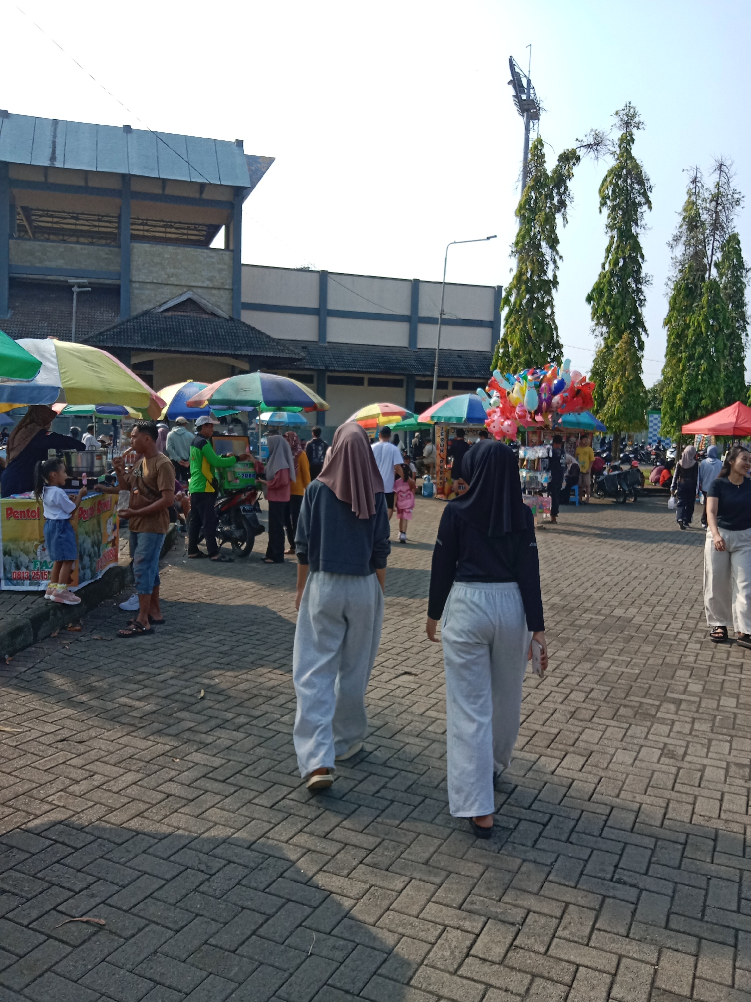 The image depicts an outdoor scene on a paved area, likely a public space in Kendal, Indonesia. Two women are walking away from the viewer, one wearing a grey top and beige hijab with light grey pants, and the other in a black top with a black hijab and light grey pants. The ground is paved with grey brick. In the background, numerous people and vendors are visible under colorful umbrellas, possibly a market or fair. There are food stalls and a balloon vendor among them. To the left, a vendor is seen with a small child, with signage indicating local fare like "Pentol." In the backdrop, there is a building with a grey roof, along with tall trees and a tall lighting structure with bare branches. The lighting and shadows suggest it is daytime.