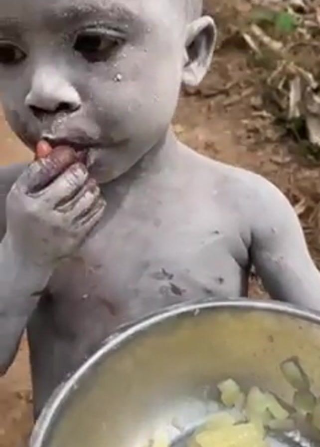 A young child is covered in a greyish-white powder substance. The child is shirtless and standing outside in what appears to be a rural environment with dry leaves and vegetation on the ground. The child is eating chopped pieces of what looks like pineapple from a silver bowl held in their left hand. Their face is smeared with the food. The surroundings suggest a simple outdoor setting.