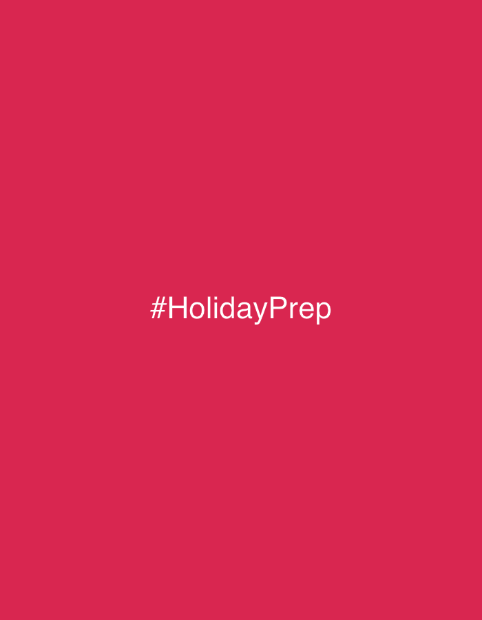 The image displays a solid crimson-red background. Centered horizontally and vertically on this field is white, sans-serif text reading "#HolidayPrep". No specific physical location within Saint-Ouen-sur-Seine, France, is discernible. The image does not contain any depictions of people, tangible subjects, objects, actions, interactions, or environmental elements beyond the abstract graphic composition of color and text.