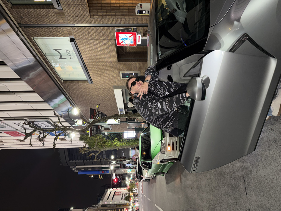 An image captured at night depicts an urban street scene in Shibuya, Japan, specifically adjacent to the Shibuya Modi building, identifiable by the "MODI" signage on the multi-story structure to the right. In the foreground, a person, likely male, is partially seated or leaning into the open driver's side door of a silver Nissan GT-R (R35 model). This individual wears dark sunglasses, a black jacket patterned with white text (e.g., "BALENCIAGA", "BLNCG"), dark pants, and light-colored shoes. The left hand is raised, displaying two fingers in a 'V' gesture, while the right arm rests on the car's roofline. Behind the silver GT-R, a line of vehicles is stopped on the asphalt street. The most prominent vehicle in this line is a bright green and white modified Nissan Skyline GT-R R34 with its headlights illuminated. Further back, other cars are visible, including what appears to be another white Nissan GT-R R34, extending down the street towards a visible traffic light showing red in the distance. The right side of the frame features the Shibuya Modi building, characterized by a lower section with brick-like cladding and upper sections with metallic panels and large windows. Streetlights illuminate the scene, casting light on the bare branches of a street tree positioned between the lampposts. Various street signs are visible, including "NO SMOKING ON THE STREET" and a red square sign with a pedestrian icon crossed out and a right-pointing arrow, indicating a pedestrian restriction. The sky is dark, consistent with nighttime conditions.