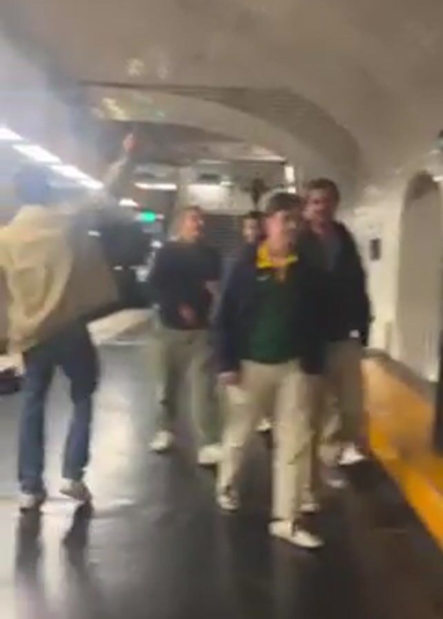Several men are walking along a subway platform. They appear to be in good spirits, with some singing and smiling. The platform is clean and modern, and the walls are tiled. There's a sign for a station called "République" in the background.