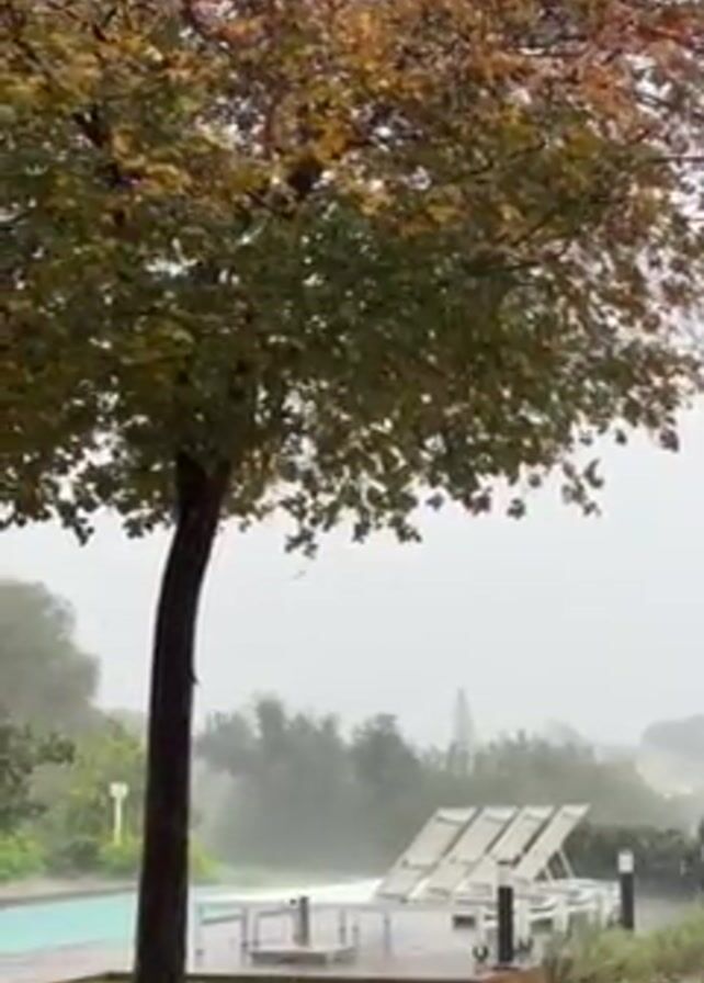 rainy day in a resort-like setting. A tree with green and some orange leaves is in the foreground. To the left of the tree is part of a blue swimming pool. In the background are three white lounge chairs on a wooden deck. It is raining hard, and the air is misty. The sound of rain is audible. There are some other trees and greenery in the distance.