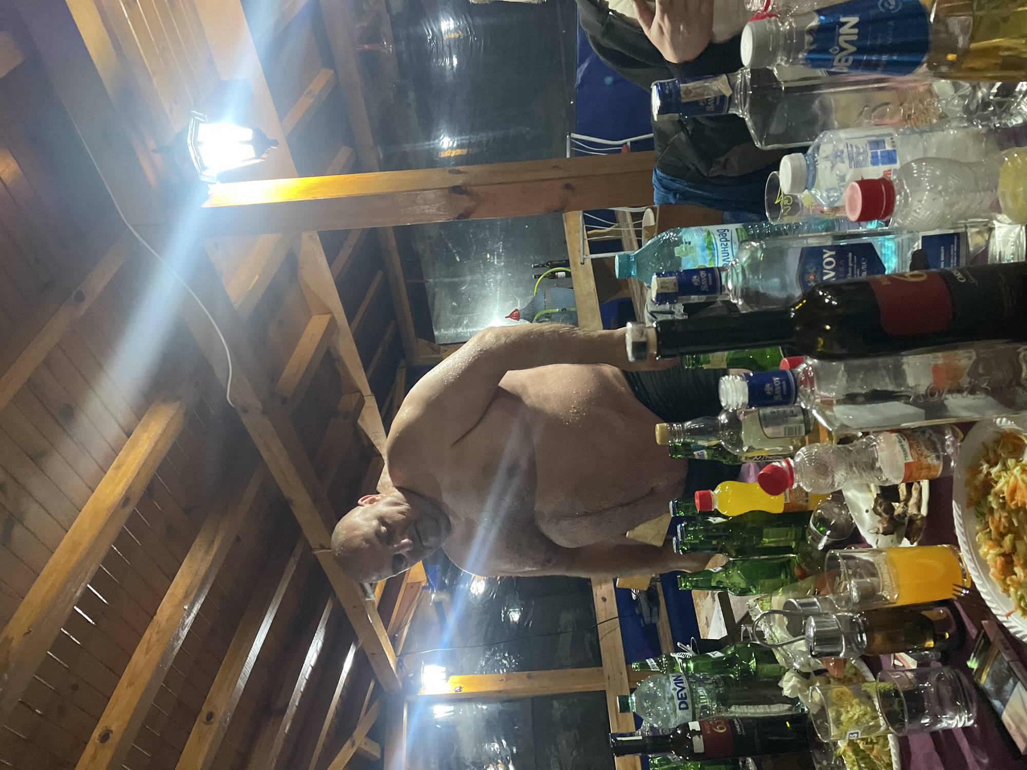 The image depicts a gathering, possibly a celebration, under what appears to be the wooden structure of a roof or an attic. A shirtless man, seemingly sweaty, is in the foreground. The table is cluttered with numerous bottles of alcohol, glasses, and a plate of salad. The specific location is Ugarchin, Bulgaria, based on the presence of Bulgarian brand bottles, for example “Devin” water. The setting appears to be a private residence or a covered outdoor area.