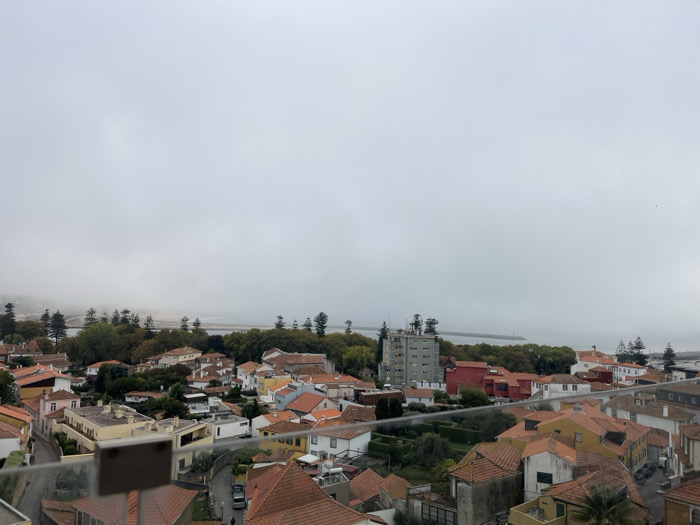 This image displays an elevated, panoramic view of a coastal urban area within Aldoar, Foz do Douro e Nevogilde, Portugal. The scene is set under an overcast, light gray sky, which dominates the upper half of the frame, indicating heavy cloud cover or fog and limited visibility. A clear glass barrier is visible across the immediate foreground, suggesting a vantage point from a balcony or high structure. The midground features a dense concentration of residential buildings, predominantly characterized by terracotta tiled roofs. Building facades exhibit varying colors, including white, yellow, and red, interspersed with green trees and garden plots. A notable multi-story gray building with a flat roof is situated among the traditional structures towards the right side of the frame. Streets and pathways are visible winding between the buildings. In the background, a body of water, consistent with the Atlantic Ocean or the Douro River estuary, stretches towards a prominent, lengthy breakwater or pier that extends into the water from the right. A small white structure, consistent with a lighthouse or navigation marker, is positioned at the far end of this breakwater. A lighter-colored landmass, possibly a sandy beach or riverbank, borders the water to the left. No individuals, specific actions, or interactions are discernible within the frame.