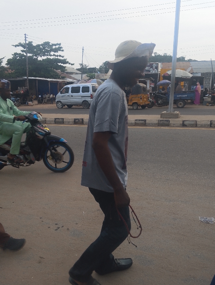 The scene depicts a bustling street in the city of Zango-ndaji, Nigeria, under an overcast sky. In the immediate foreground, an adult male, of apparent African descent, walks right to left, mid-stride. He wears a light-colored bucket hat, a light grey short-sleeved t-shirt, dark trousers, and black slip-on shoes. His right hand holds a coiled red object, consistent with a stethoscope. The lower leg and foot of another individual are partially visible to the lower left. In the midground, a light blue motorcycle, ridden by a male in light green traditional attire and a matching cap, moves left to right. Behind the motorcycle, a grey concrete road barrier separates the main thoroughfare from a commercial strip. On the far side of this barrier, multiple vehicles are present: a silver passenger van, a yellow motorized tricycle, and a blue flatbed utility truck. A tall, light-colored street light pole stands prominently on the right side of the road. The background features a row of single-story buildings and market stalls with varied roofing materials, including corrugated metal. Multiple individuals are visible congregating near these structures, suggesting commercial activity. Utility poles with overhead lines are visible against the pale sky, and scattered trees with green foliage are present. The road surface is light brown, appearing to be a mix of asphalt and dirt.