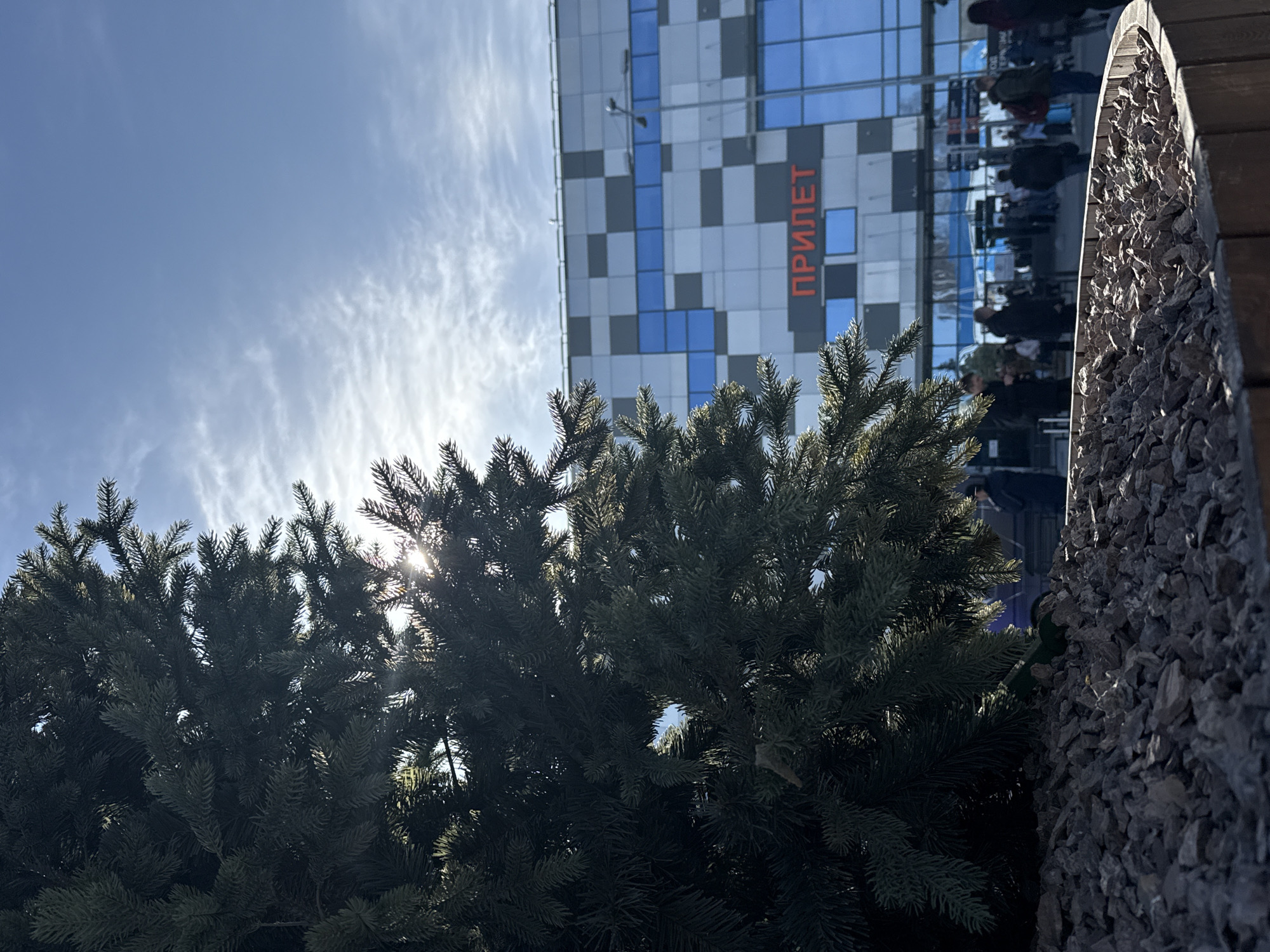 The image is taken at an upward angle, showcasing a combination of natural and architectural elements. The foreground is dominated by green coniferous trees, obscuring part of the building behind. Sunlight filters through the tree branches, creating a bright effect. Behind the trees is a multi-story building with a modern facade consisting of gray and blue square panels. A vertical sign with the word "ПРИЛЕТ" in orange color is visible on the building. To the right, there is a stone-filled planter box with rough, dark-colored stones. The sky is partially visible with scattered cirrus clouds. The presence of the sign "ПРИЛЕТ" suggests the image was taken at a location within the city of Ufa, Russia, and possibly close to a transportation hub. People appear as reflections in the windows.