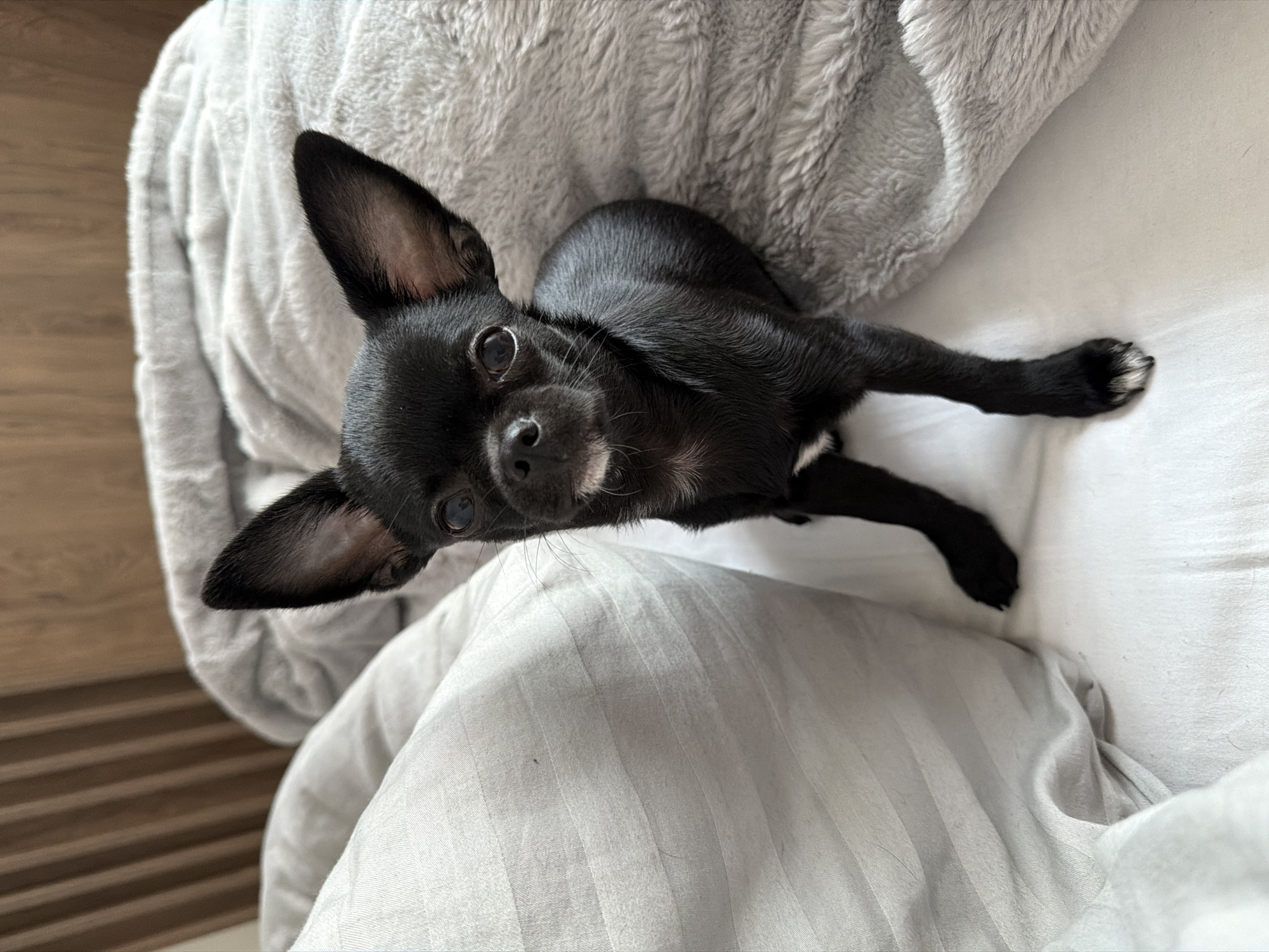 **Location:** Boreti, Montenegro. **Scene Description:** A small, short-haired black chihuahua dog is depicted seated upright on a bed, facing directly towards the observer. The dog possesses large, erect ears and dark, round eyes. A small area of white fur is visible on its chin and upper chest, with additional white markings present on the tips of its front paws. The dog rests on a white bedsheet. To the left, a portion of a white pillowcase or bunched sheet with subtle vertical stripes is visible. To the right and partially behind the dog, a light grey, fluffy, textured blanket or comforter is present. The background consists of a light brown wooden headboard featuring vertical slats. The illumination appears consistent with an indoor setting. No other individuals or active interactions are observed within the frame.