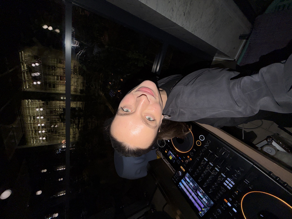 A person stands in front of a DJ setup, seemingly taking a selfie