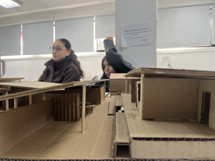 The scene is an indoor environment, likely a classroom or design studio, located in San Andrés Cholula, Mexico. In the foreground, a detailed architectural scale model constructed primarily from corrugated cardboard and thin wooden dowels occupies the lower half of the frame. The model features multiple levels, distinct structural sections, walls, and roof elements, with the corrugated edges of the cardboard visible along its construction. Two individuals are positioned in the midground, partially obscured by the model. On the left, a female with dark, wavy hair and glasses is seated, wearing a dark brown jacket. She is looking towards the right side of the frame, past the model. To her right, another individual, whose face is partially obscured, has their right arm raised with the hand near their head, wearing a dark garment. The background consists of light-colored walls. A horizontal window with white horizontal blinds is visible across the upper portion of the background. A fluorescent light fixture is partially visible in the top left corner. A white sheet of paper is taped to the wall, displaying text in Spanish, including "Reunión 23 de octubre" (Meeting October 23rd). No specific actions or interactions are discernible among the individuals; they are present in the room with the static architectural model.