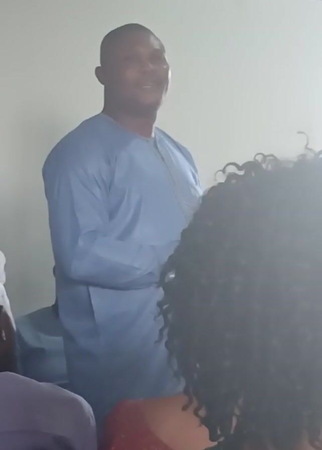 A man in a light blue, long-sleeved shirt stands and addresses an unseen audience. His face is visible, and he is smiling. A person with curly black hair is in the foreground, partially obscuring the view. Other people sit at a table and are partially visible. The setting appears to be indoors.