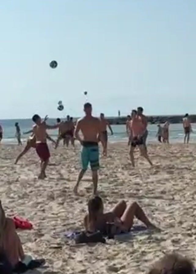 A sunny beach scene depicts a group of shirtless young men playing with multiple soccer balls in the sand