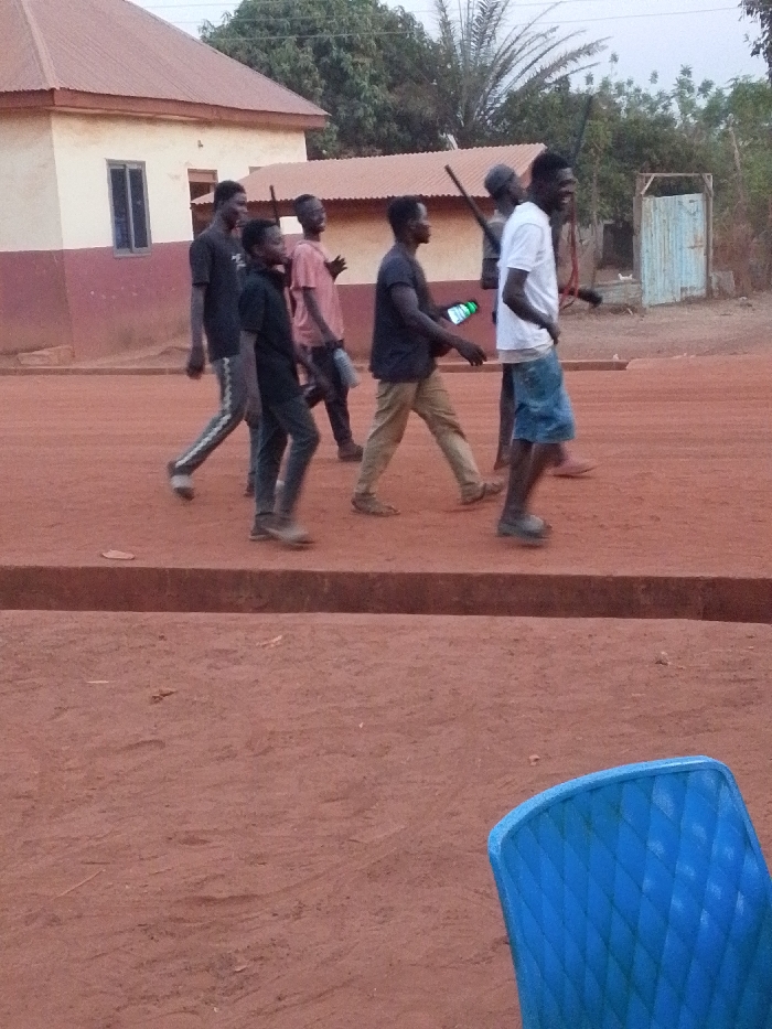 Six men are walking in a line on a dirt road. They are dressed in casual clothing. At least two of the men are holding rifles. Buildings can be seen in the background, including what appears to be a small outhouse. A blue plastic chair is visible in the foreground.