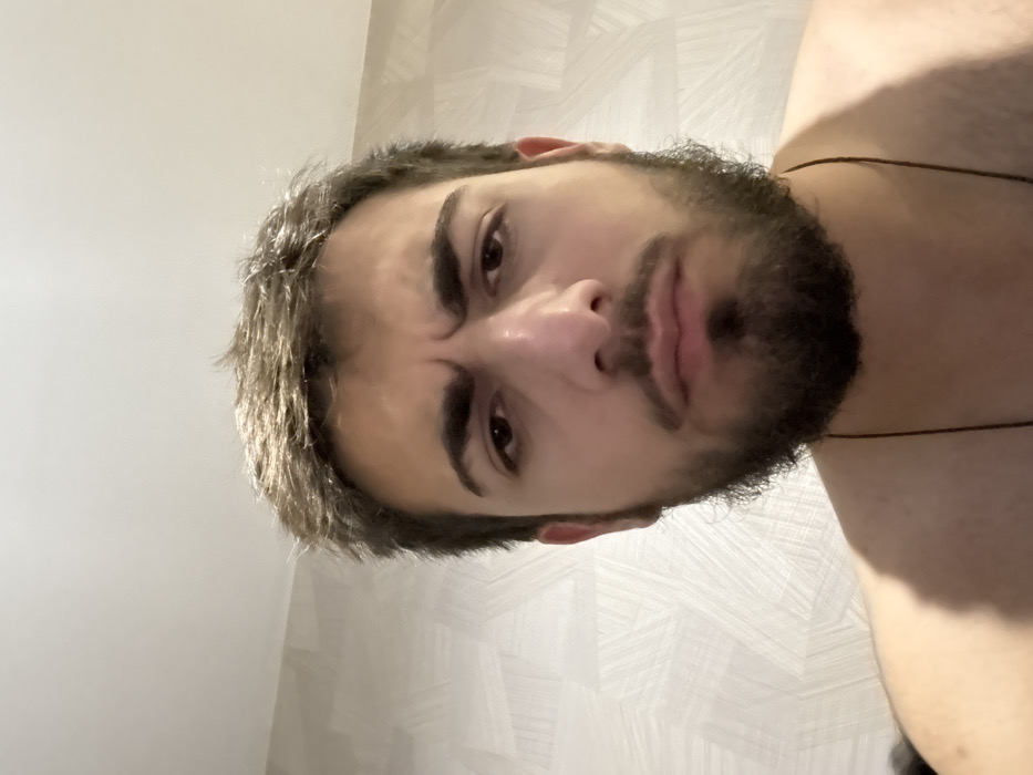A close-up, head-and-shoulders portrait depicts an adult male looking directly at the camera. He has dark, slightly disheveled hair, dark eyes, and a full dark beard covering his jawline and chin. His eyebrows are furrowed, and his mouth is slightly downturned, conveying an expression of mild contemplation or displeasure. He appears shirtless, with bare shoulders and upper chest visible. A thin, dark cord or necklace hangs around his neck. The background consists of a light-colored wall with a subtle, repeating geometric pattern, likely wallpaper, and a plain white ceiling above. The lighting is uniform, suggesting an indoor environment. The specific location within the city of Tbilisi, Georgia, cannot be determined from the visual information present in the image.