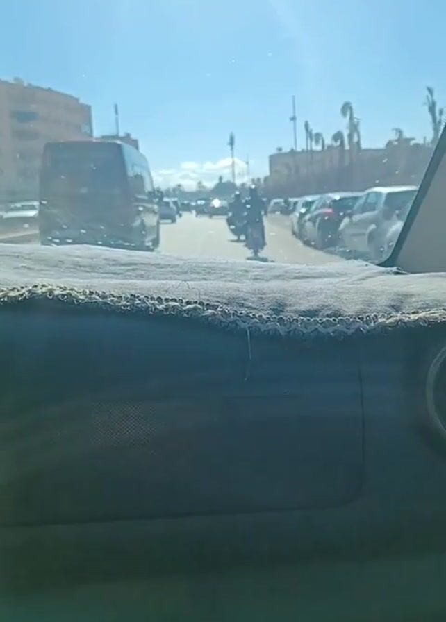 view from inside a car, looking out through the windshield. The car is stationary on a city street lined with buildings and palm trees under a bright, clear sky. Several cars and a motorcycle are visible on the road ahead. The dashboard of the car is visible at the bottom of the frame, covered with a textured, gray material.