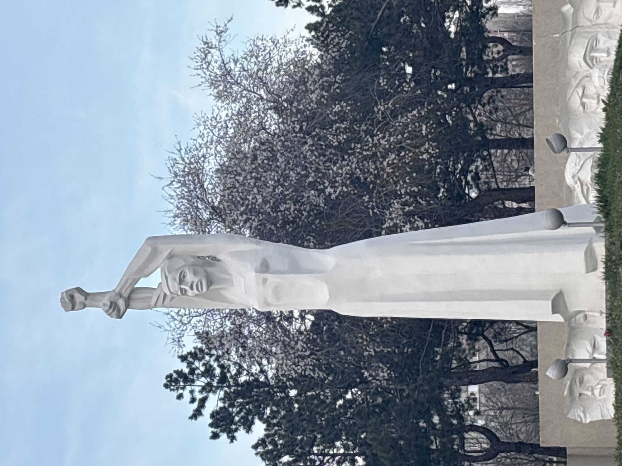 - "The image depicts a white stone statue of a woman with her arms raised and fists clenched, set against a backdrop of trees and a pale blue sky" by FM-UOwZk1, licensed under CC BY 4.0