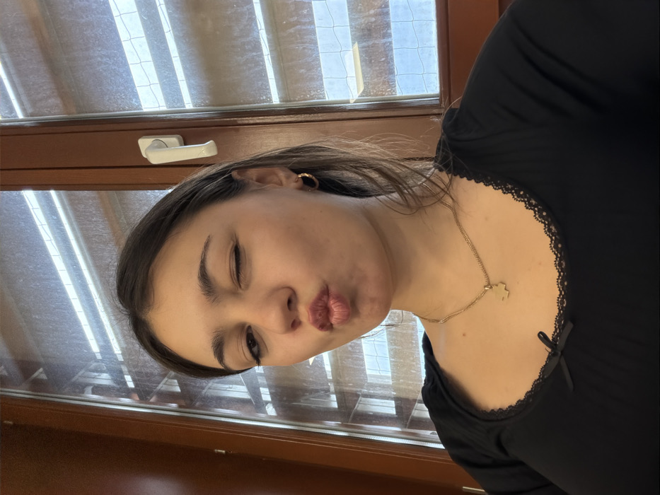 A young female subject is depicted in a close-up, chest-up portrait, winking with her right eye (viewer's left) and pursing her lips. Her dark hair is visible, and she is wearing a black long-sleeved top with a lace-trimmed scoop neckline and a small black bow positioned centrally on the chest. She wears a thin gold-colored chain necklace with a small, irregular, possibly star-shaped pendant, and small gold-colored hoop earrings in both ears. The background features a brown window frame with a white handle on the right side. Through the window, horizontal blinds or shutters are visible, suggesting an interior setting. This scene is located in Schiltigheim, France.