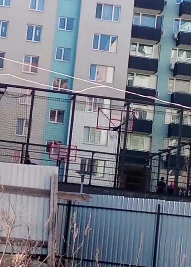 n outdoor basketball court in an urban setting. There are at least three people on the court, appearing as small figures from the camera's perspective. The court is enclosed by a black wire fence. Beyond the fence is a gray corrugated metal fence and some scattered debris and dry vegetation. In the background, there is a tall multi-story apartment building, with its facade featuring a combination of gray, light blue, and white sections. The building has numerous windows, some with visible curtains or personal items inside. The sky is clear and light in color. The camera is relatively static, providing a view through the fence towards the basketball court and the building in the background.