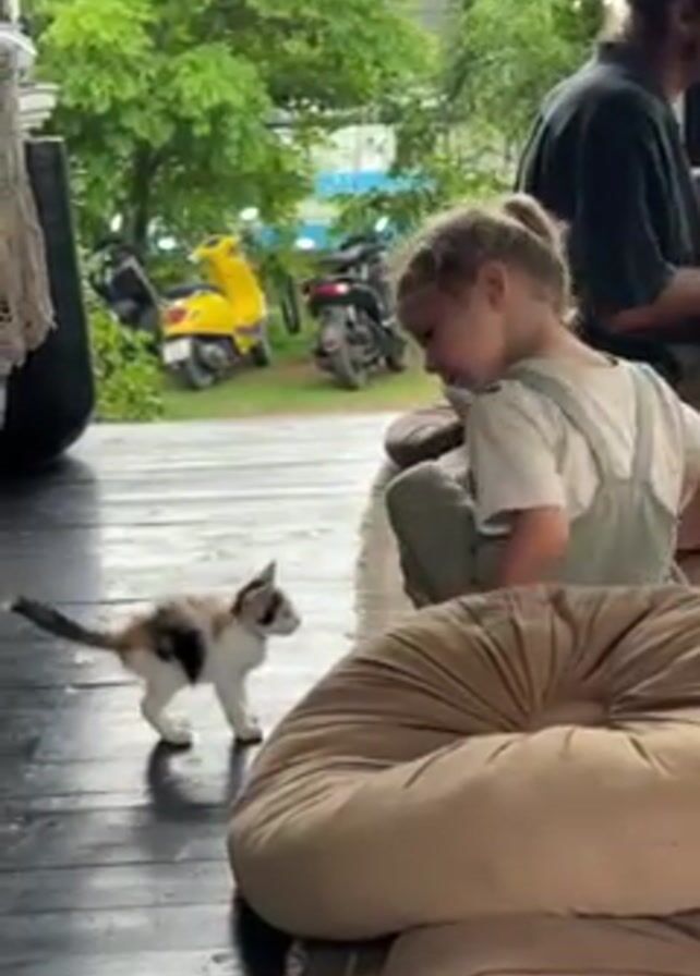 A little girl with her blonde hair in a ponytail is petting a small calico kitten on a porch. The girl is barefoot and wearing light green overalls and a white t-shirt. She is kneeling on a large, tan cushion. The kitten is standing on the wooden floor of the porch and its tail is up. Behind the girl and to the right, a man with long hair is seated, partially visible. In the background, there are trees, several parked motor scooters, and a building. The porch also contains a black speaker and a table with a white lace tablecloth. The overall setting is outdoors, possibly a restaurant or cafe porch.