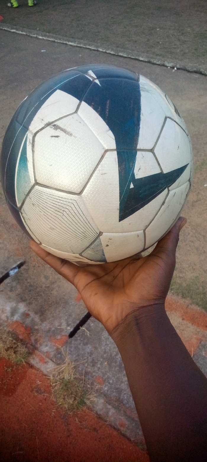 A hand with dark skin holds a white and blue soccer ball. The ball is scuffed and has a pattern of hexagons and pentagons. The background includes a blurry view of a grassy area, a concrete surface, and an orange border. The hand is outstretched, supporting the weight of the ball. Other blurry objects are in the image background.