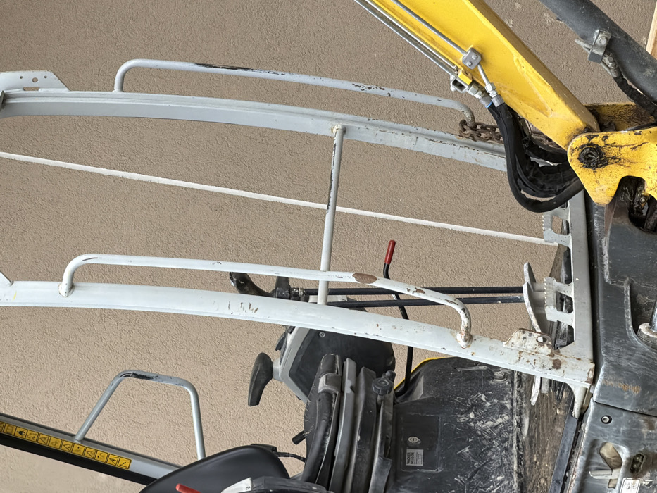 The image depicts a stationary Wacker Neuson compact excavator located in the city of Zurich, Switzerland. The foreground features the operator's station of the excavator, partially visible, including a dark grey, dirty seat, a grey control console with several black levers, and a red-handled lever positioned within the safety frame. A prominent light grey tubular Roll-Over Protective Structure (ROPS) / Falling Object Protective Structure (FOPS) encloses the operator's area, showing signs of paint chipping, scratches, and minor surface rust. To the lower right, a bright yellow section of the excavator's hydraulic boom arm is visible, featuring black hydraulic hoses connected by metal fittings. The entire machine exhibits dirt and wear consistent with operational use. The background consists of a plain, light brown, textured building wall, against which two faint vertical lines are discernible. No individuals or active work are present in the scene.