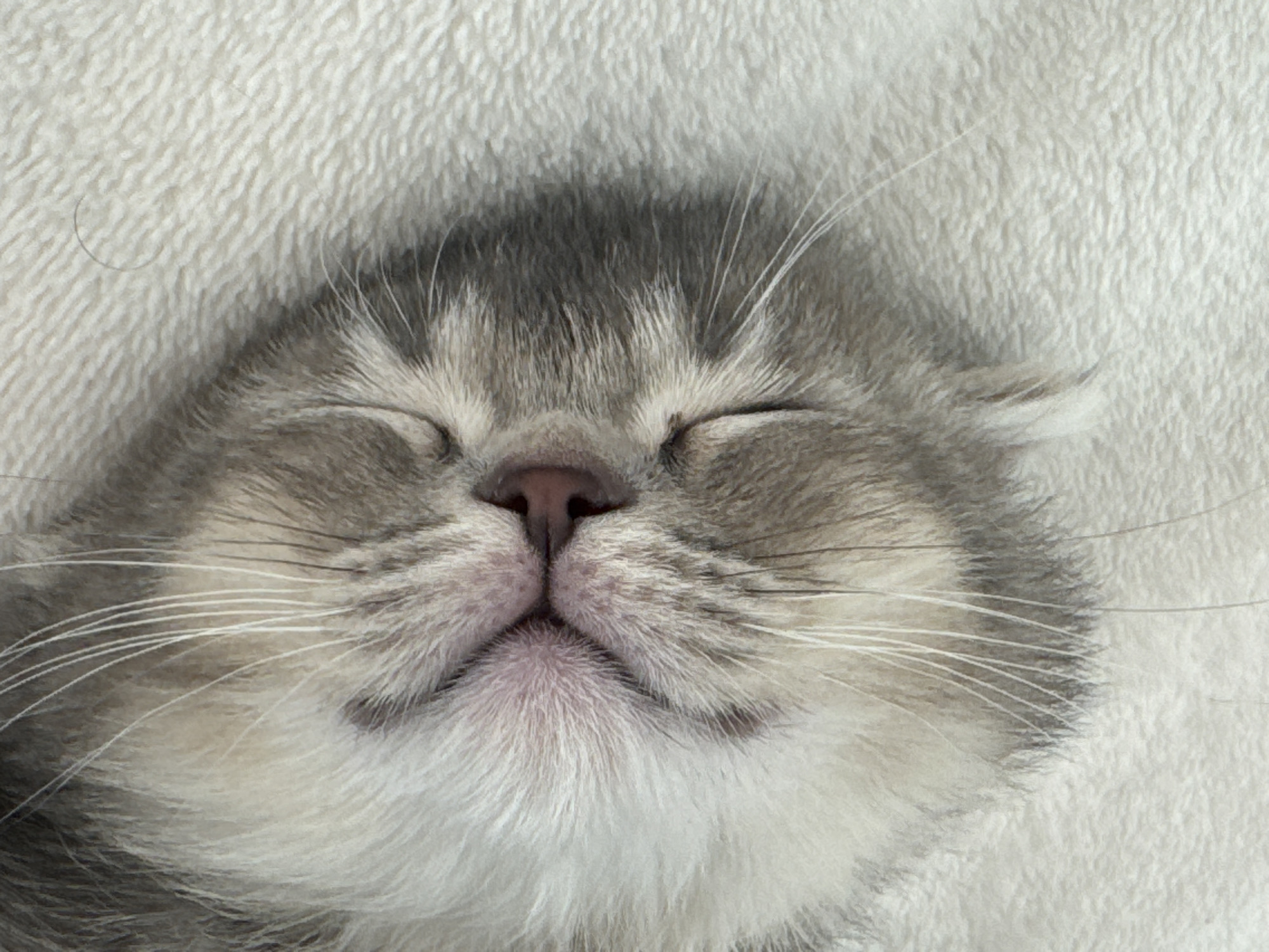 The image displays a close-up, inverted view of a domestic feline kitten in a state of repose. The kitten's head and upper chest are primarily visible, characterized by soft fur in shades of light grey and white. Its eyes are closed, indicating sleep or deep relaxation. A small, pink nose is centered on the muzzle, with delicate pink skin visible around the philtrum and mouth area. Numerous long, fine white whiskers (vibrissae) extend from both sides of the muzzle. The kitten is resting on a uniformly white, soft, textured fabric surface, possibly a blanket or towel. No other subjects or objects are discernible within the frame. The scene appears to be an indoor environment. The precise location within the city of Strasbourg, France, cannot be determined from the visual evidence presented in the image.