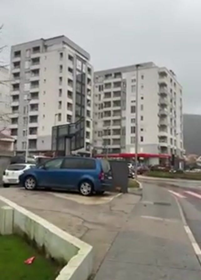 rainy day in a city. There are two tall, modern apartment buildings on either side of a street. Several cars are parked near the buildings, including a blue Volvo station wagon. Other cars are driving on the road. There is a sidewalk with a patch of grass. The sky is overcast and gray. In the distance, a mountain can be seen.
