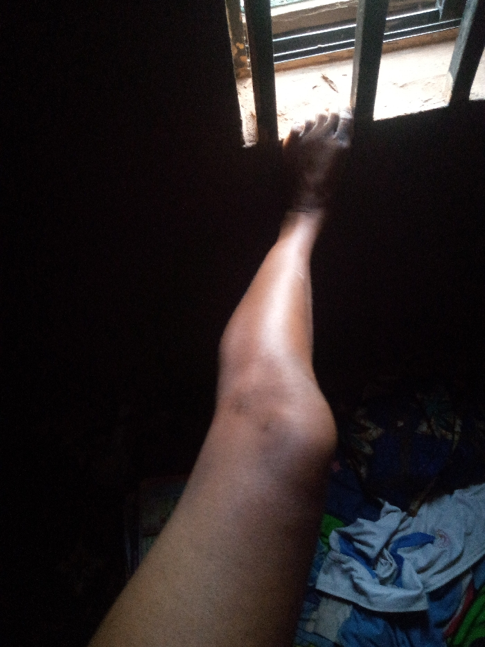 A leg is partially seen extending towards a barred window in a dimly lit space. The foot touches the bars. The rest of the room is mostly dark, but some laundry is visible on a bed next to the leg. Light filters through the window, highlighting the leg and the bars.